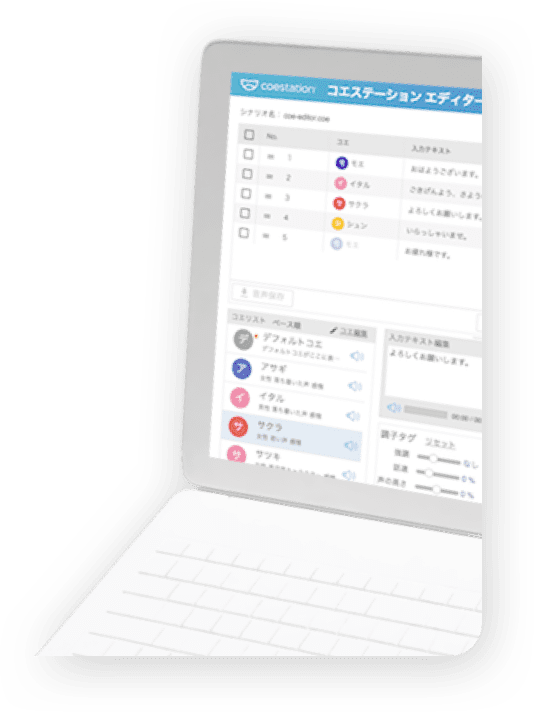 身近な人から有名人まで、多種多様な合成音声(人工の声)を生成し、様々なデバイスとつなげることのできるサービス「コエステーション」を提供しています。